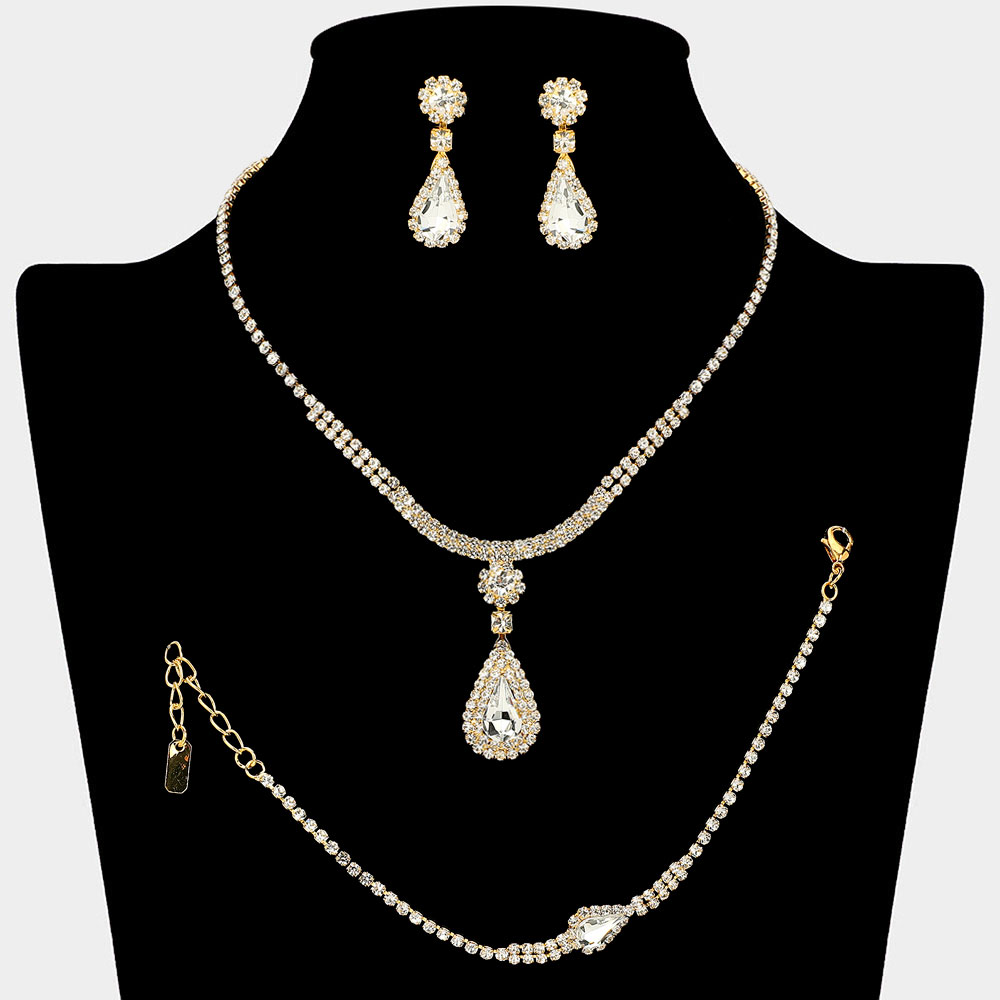 • Enhance your special occasion look with this teardrop crystal necklace, bracelet, and earring set. Featuring a radiant drop pendant and dazzling crystal accents, this timeless jewelry ensemble exudes sophistication, making it perfect for brides, galas, and formal evening events.