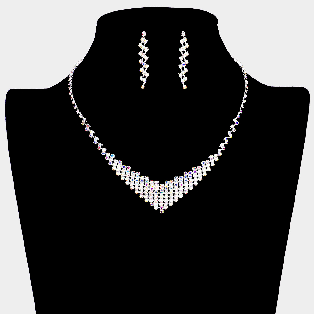 • Elevate your evening look with this rhinestone V necklace and matching earrings set. Featuring a cascading rhinestone design, this jewelry set adds refined sparkle and sophistication, perfect for weddings, prom, and special occasions where timeless elegance is a must.