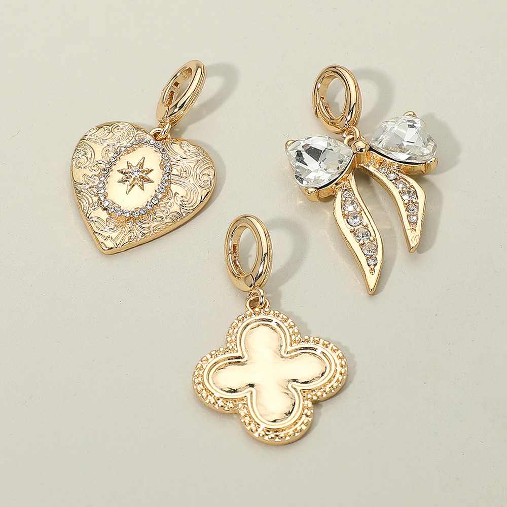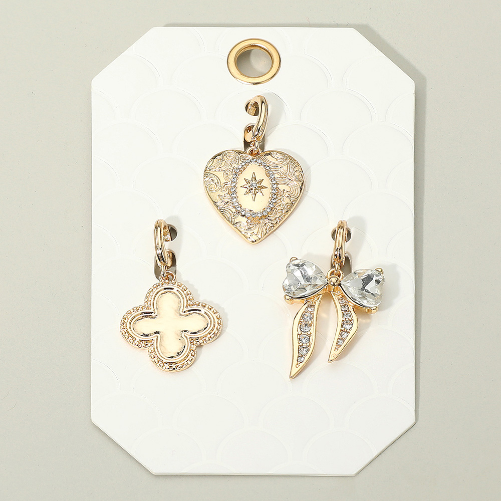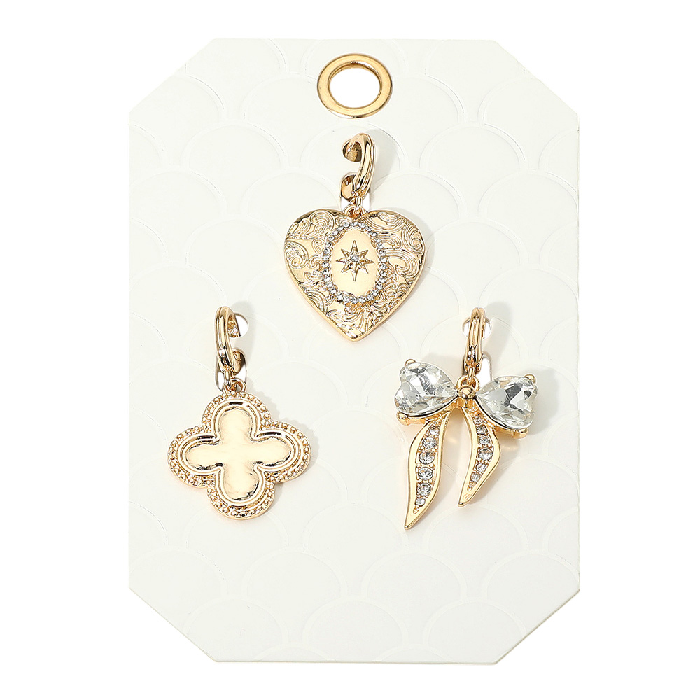 Details • Size : 1.5" - 1.75" L • Elegant charm pendant set featuring a heart with engraved detail, a clover design, and a sparkling bow. Versatile and stylish, these charms can be added to necklaces or bracelets for a personalized jewelry look. • Lead and Nickel Compliant