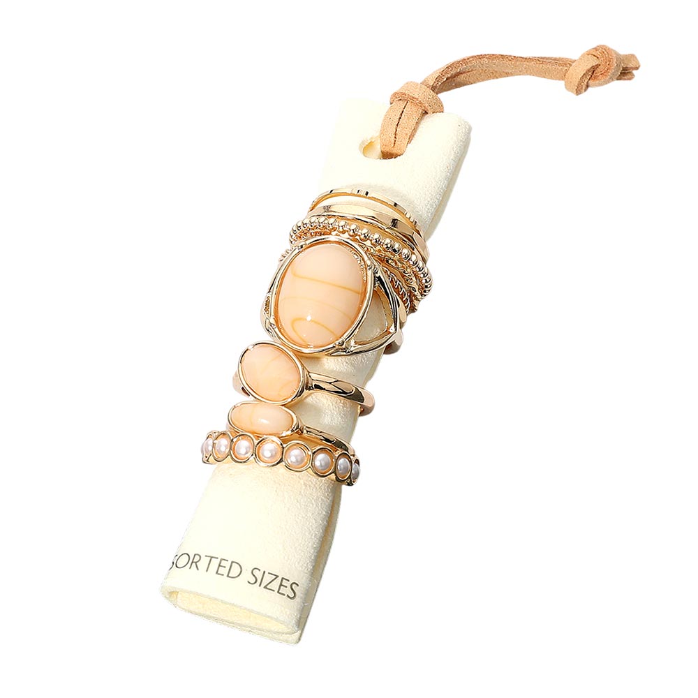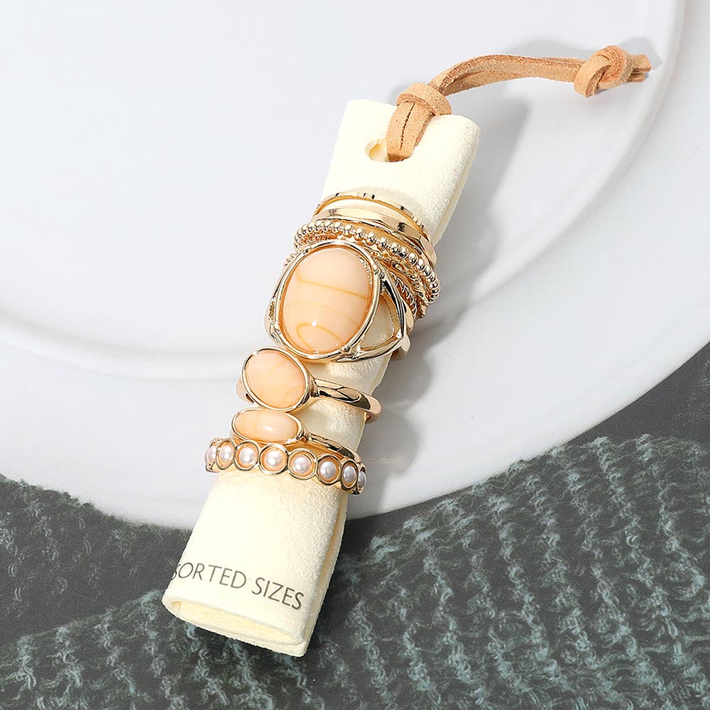 12PCS - Assorted Resin Stone Accent Pearl Link Textured Metal Stackable Ring Set