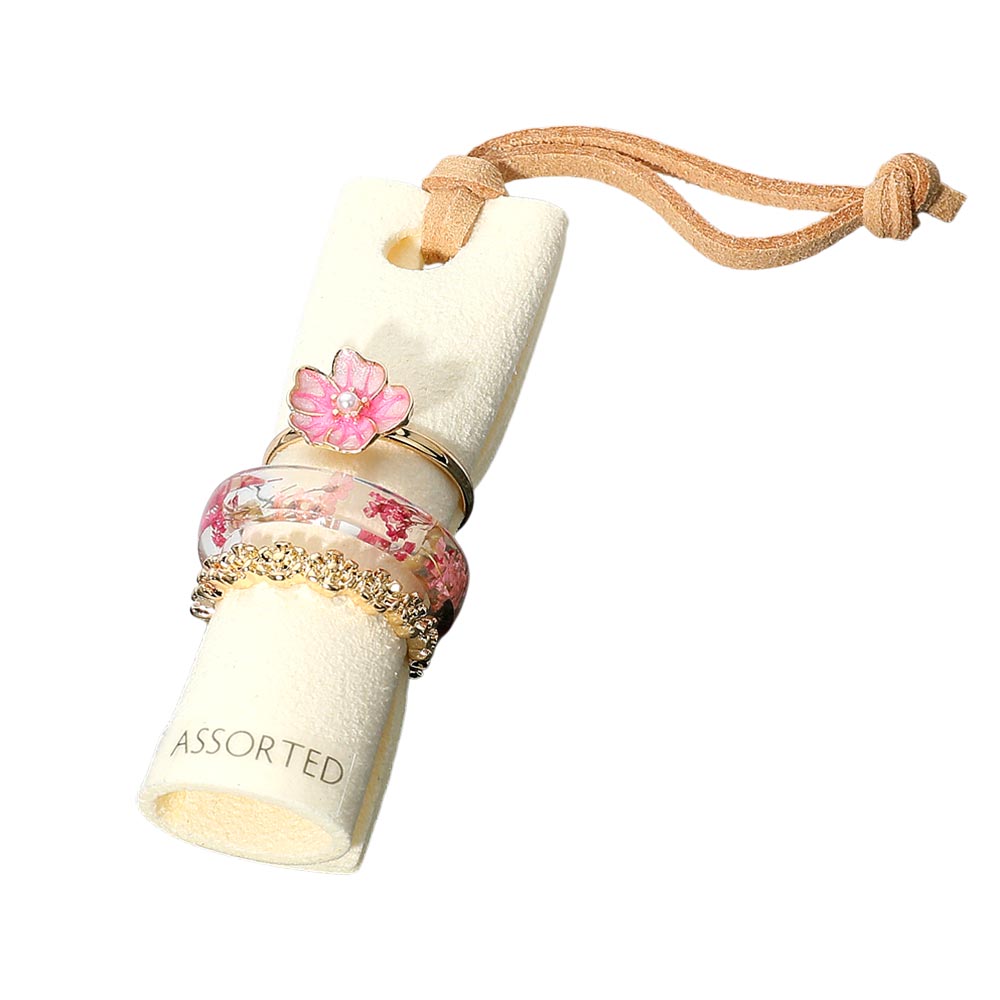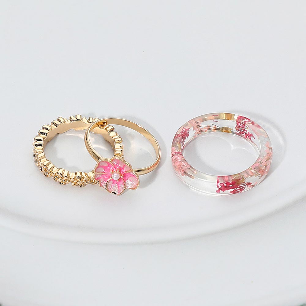 • A charming assorted ring set featuring a delicate floral ring, a clear resin band with embedded accents, and a textured stacking ring. Perfect for mixing and matching, gifting, or adding a playful, feminine touch to everyday looks with a unique blend of styles and textures.