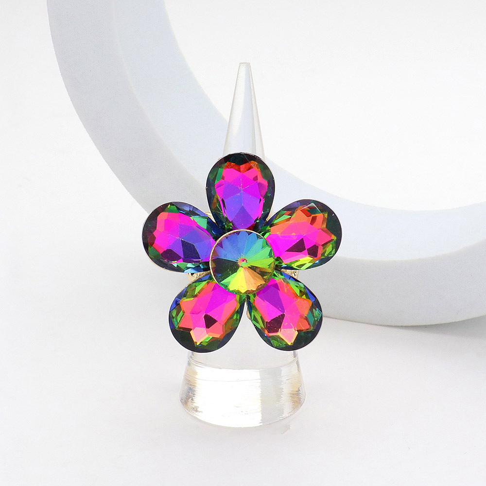 Details • Size : 1.5" H • Stretchable • Elegant flower-shaped statement ring featuring a dazzling faceted petal design that catches the light beautifully. Perfect for adding a bold, eye-catching accent to any outfit, this gem-inspired accessory enhances your style with its unique shape and sparkling radiance. • Lead and Nickel Compliant