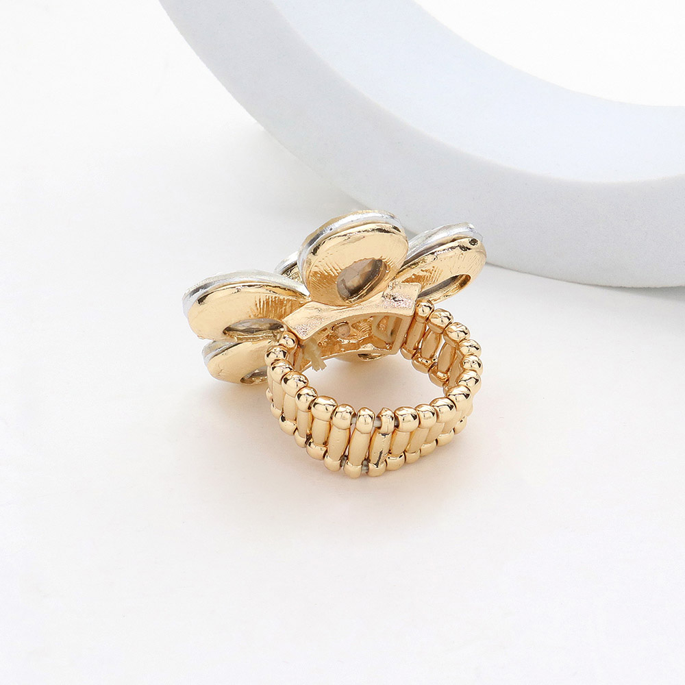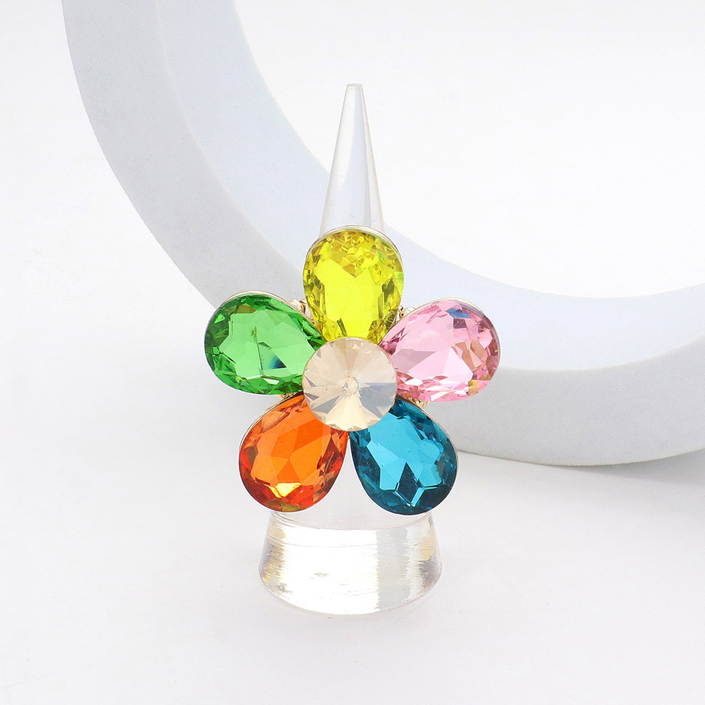 Details • Size : 1.5" H • Stretchable • Elegant flower-shaped statement ring featuring a dazzling faceted petal design that catches the light beautifully. Perfect for adding a bold, eye-catching accent to any outfit, this gem-inspired accessory enhances your style with its unique shape and sparkling radiance. • Lead and Nickel Compliant