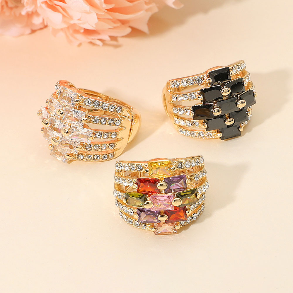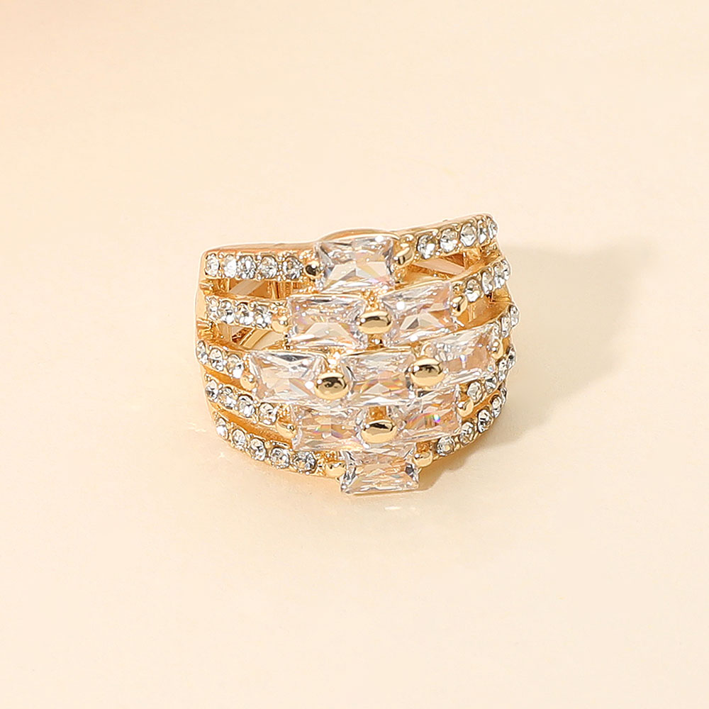 Details • Size : 0.8" H • Stretchable • This geometric crystal stretch ring showcases a bold multi-row design accented with radiant stones for a modern, statement-making appeal. Its flexible fit ensures comfort while adding a luxurious sparkle that enhances both evening ensembles and chic everyday outfits. • Lead and Nickel Compliant