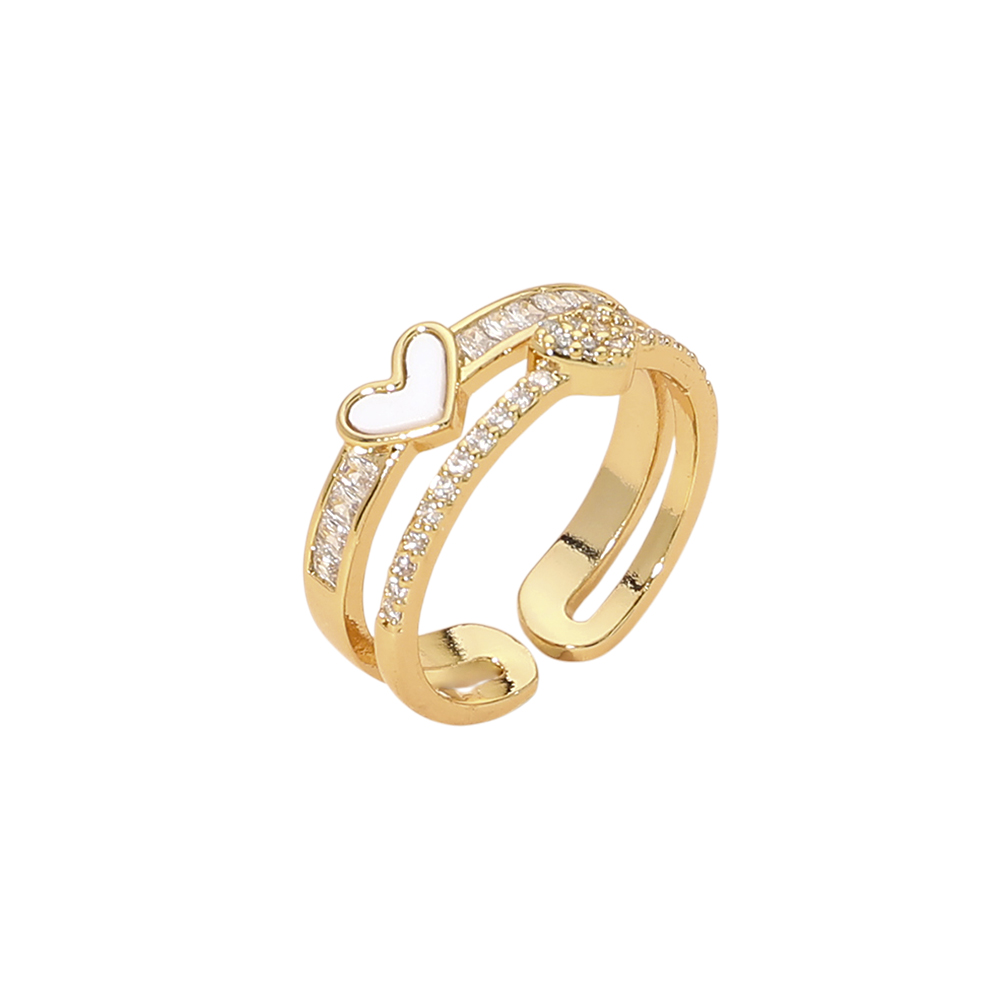 Details • Size : 0.3" H • Adjustable • Stylish adjustable ring designed with a layered double band silhouette and a delicate heart accent. Sparkling stone details add refined shine, making this ring ideal for gifting, stacking, or everyday statement wear in boutique jewelry and fashion accessory collections. • CZ Cubic Zirconia • Gold Dipped