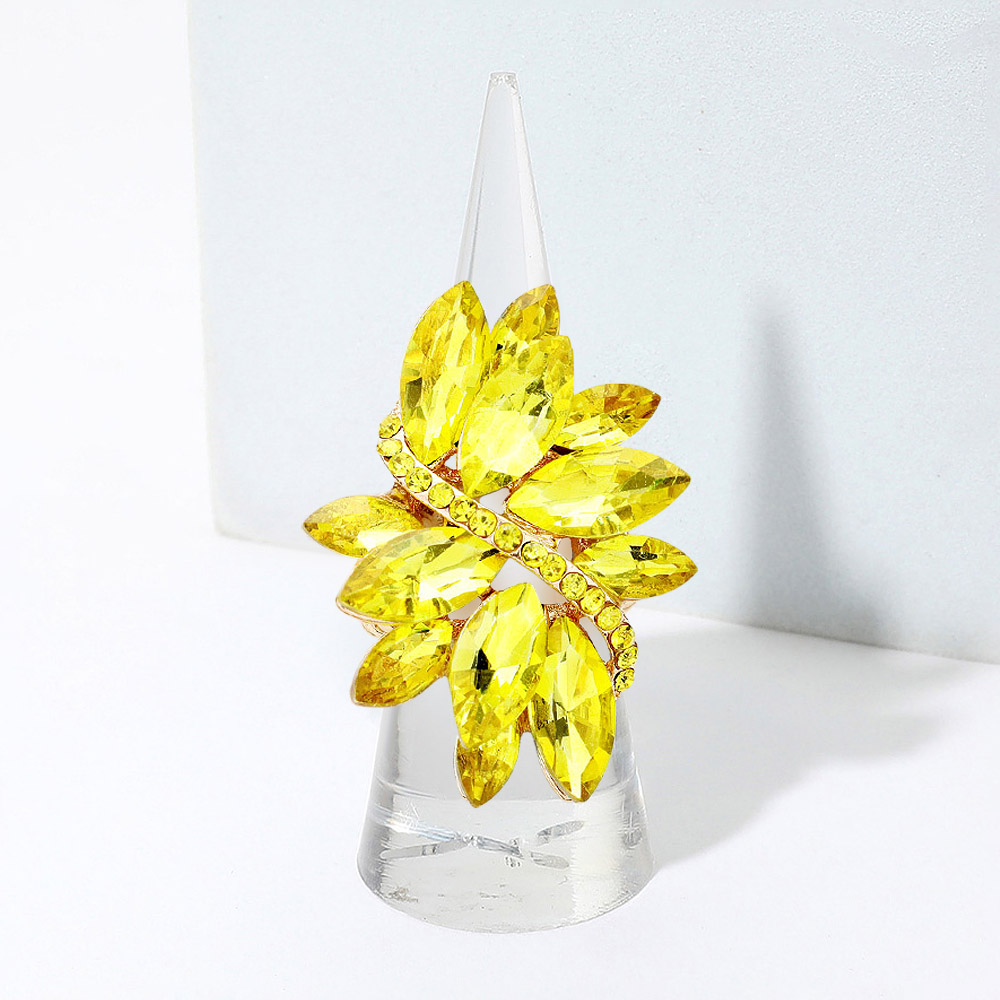Details • Size : 1" X 1.5" • Stretchable • Shine bright with a statement cocktail ring designed in a striking crystal leaf motif. Featuring multi-faceted stones and dazzling sparkle, this glamorous accessory is perfect for parties, special occasions, or elevating everyday outfits with bold elegance.