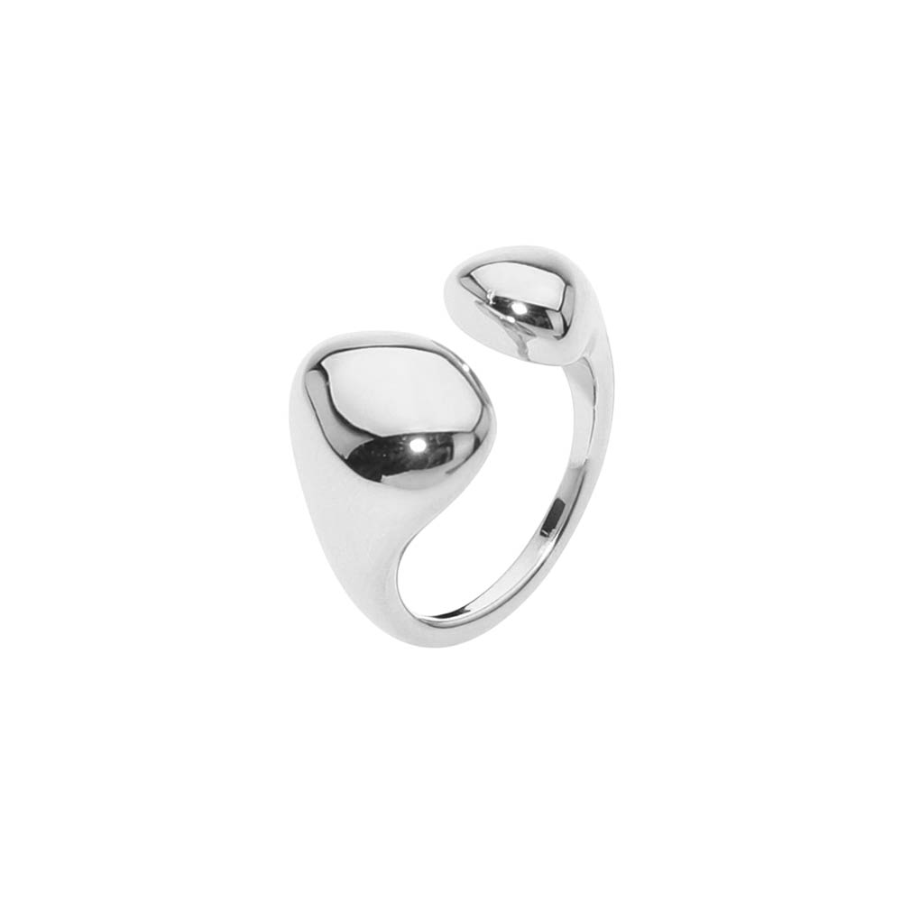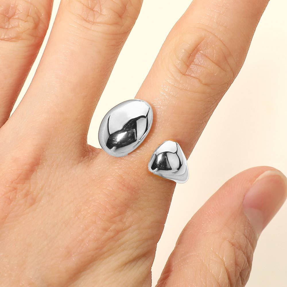 Details • Size : 0.5" H • Adjustable • Water Resistant • Bold adjustable ring featuring a smooth asymmetrical dome design that creates a modern sculptural look. The open wrap construction allows flexible sizing while delivering a high-impact statement. A versatile fashion ring ideal for everyday wear, gifting, and boutique collections seeking clean, contemporary jewelry silhouettes. • Hypoallergenic • Stainless Steel