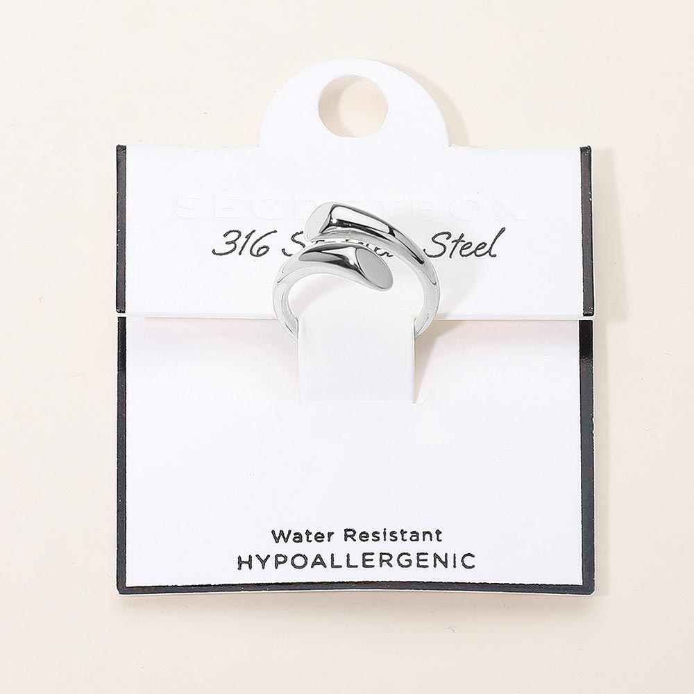 Details • Size : 0.5" H • Size 7 Only • Elegant open wrap ring featuring a modern sculptural twist design that curves gracefully around the finger. Its sleek and minimalist silhouette makes it perfect for everyday wear or layering, adding a touch of contemporary sophistication to any outfit. • Hypoallergenic • Stainless Steel