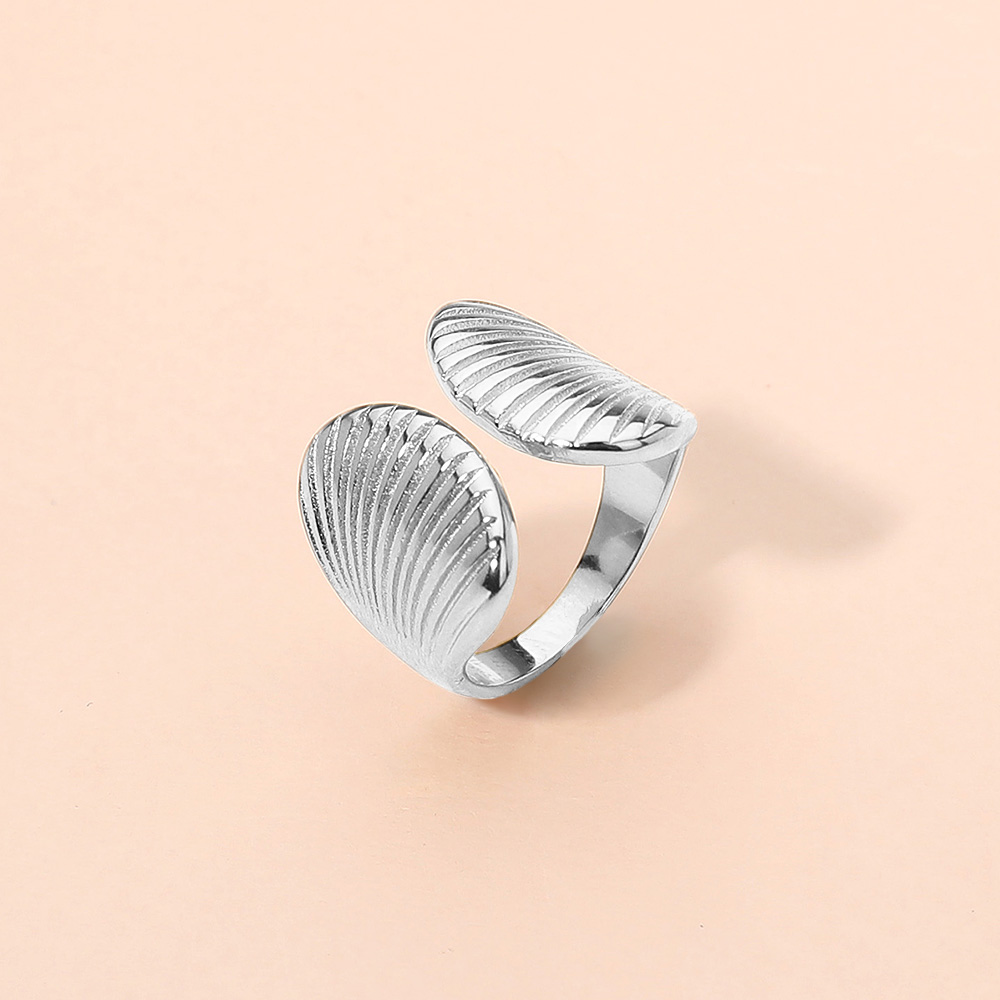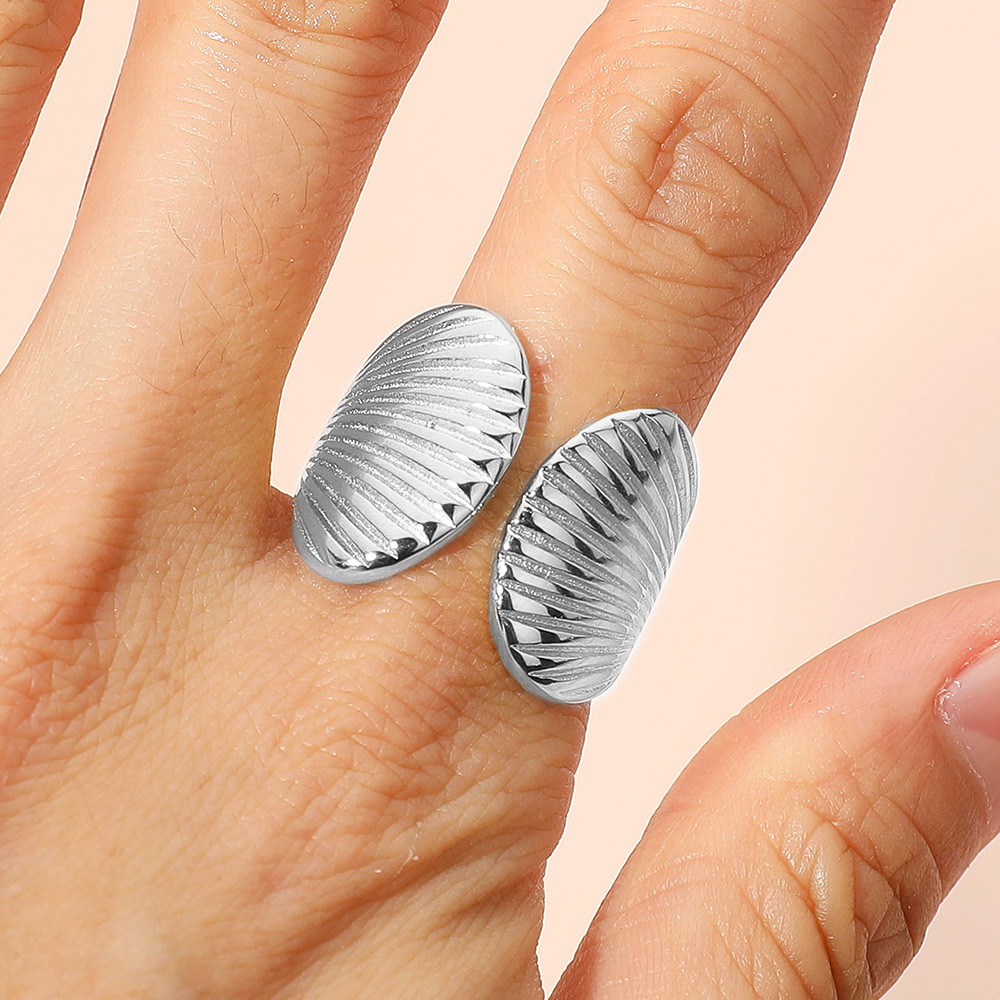 Details • Size : 0.7" H • Adjustable • Water Resistant • This stainless steel adjustable ring showcases a textured shell design, combining coastal elegance with modern durability. Hypoallergenic and water resistant, it’s perfect for daily wear and effortless style, offering both comfort and a timeless statement look. • Hypoallergenic • Stainless Steel