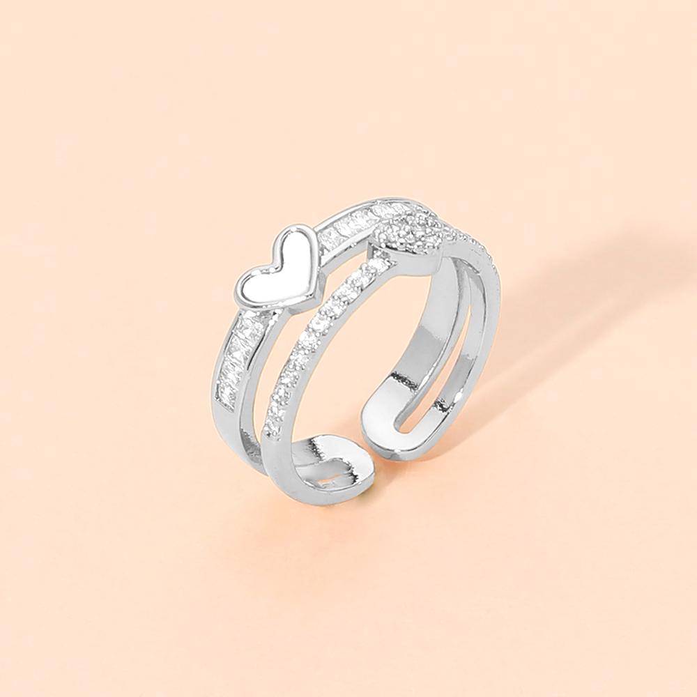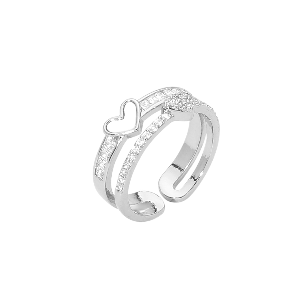 Details • Size : 0.3" H • Adjustable • Stylish adjustable ring designed with a layered double band silhouette and a delicate heart accent. Sparkling stone details add refined shine, making this ring ideal for gifting, stacking, or everyday statement wear in boutique jewelry and fashion accessory collections. • CZ Cubic Zirconia • Gold Dipped