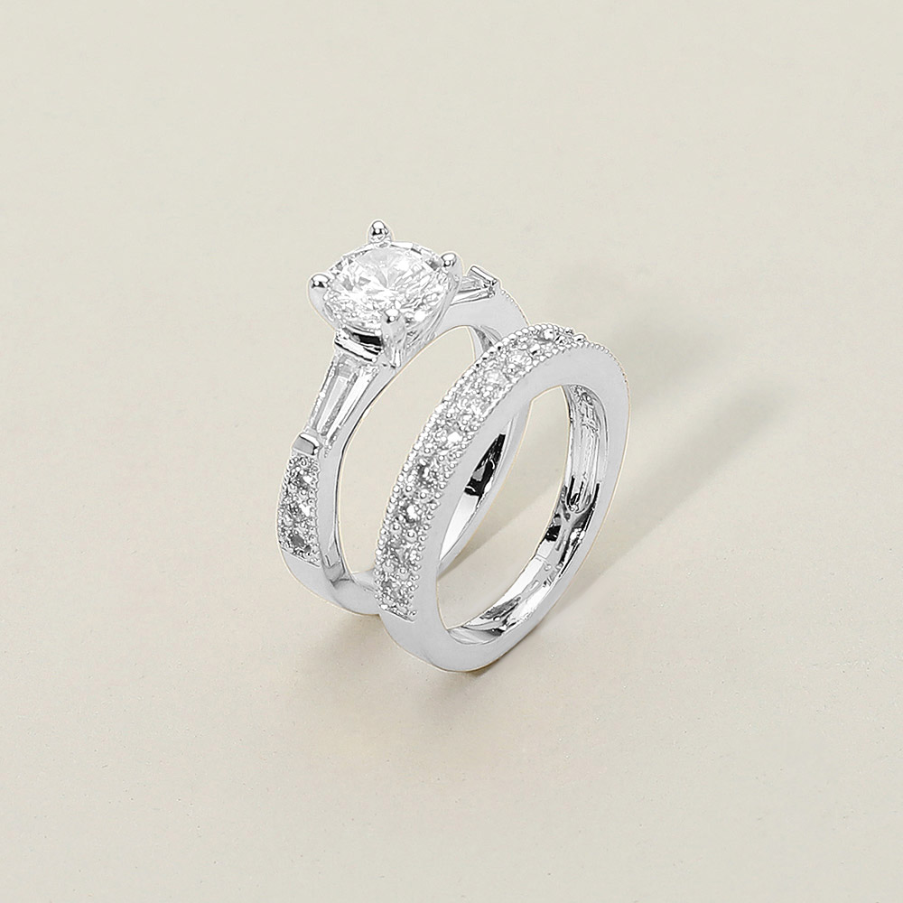 • Elegant two piece ring set featuring a round cut cubic zirconia centerpiece complemented by a matching band adorned with shimmering pave accents. A timeless and refined design perfect for engagements, weddings, or adding sophisticated sparkle to everyday looks.
