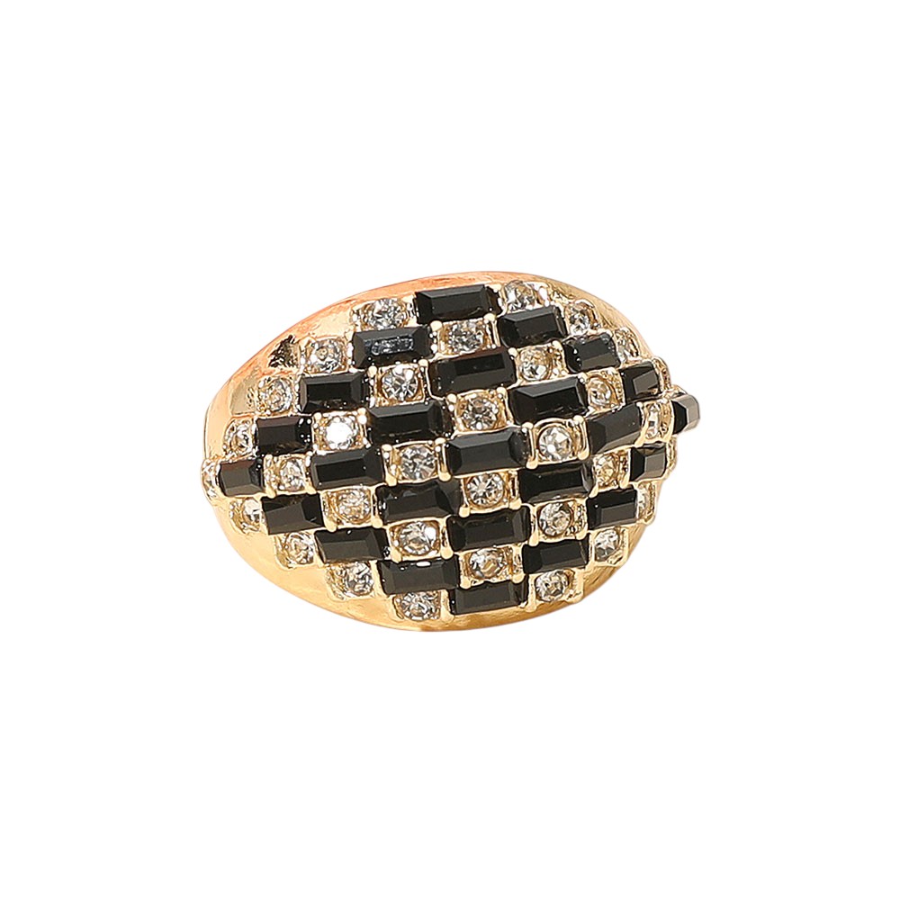 • This checkered crystal statement ring features a bold grid pattern with alternating shimmering stones that create a striking visual contrast. Designed for confident, trend-forward style, it adds instant sophistication and sparkle to any outfit, from elegant eveningwear to modern casual looks.