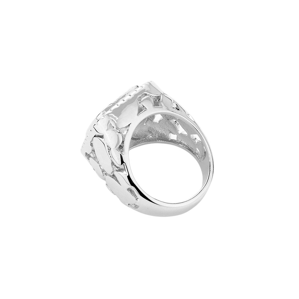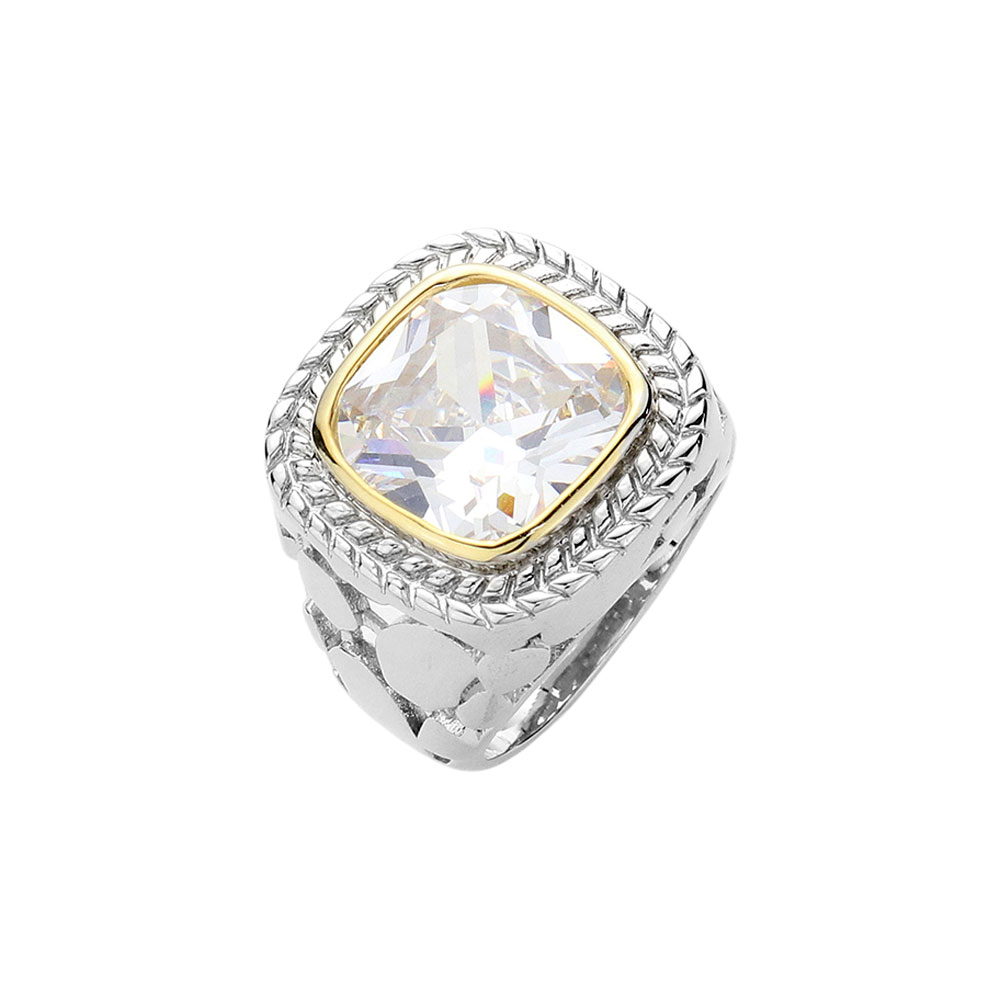 Details • Size : 0.75" H • Bold ring featuring a large cushion-cut centerpiece framed by a textured border and intricate band design. A striking accessory that adds sophistication and sparkle to any outfit. Perfect for formal occasions or making a powerful everyday style statement. • CZ Cubic Zirconia