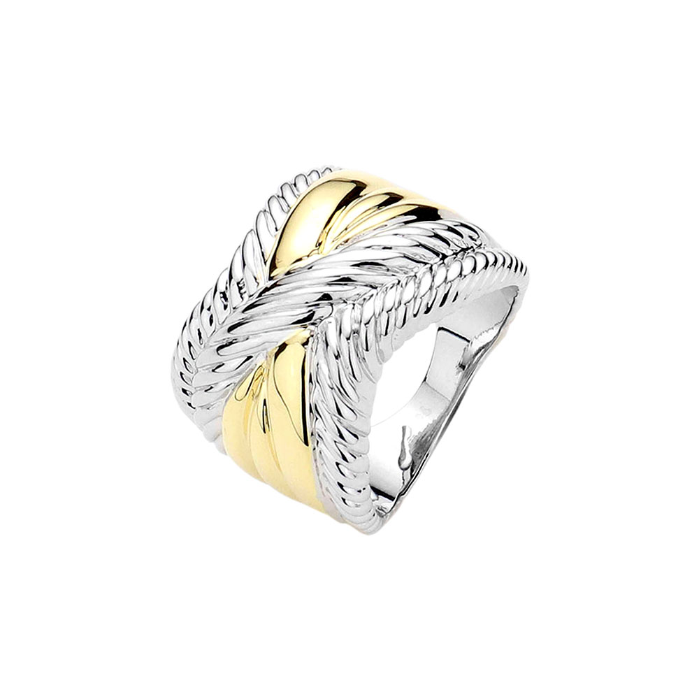 Details • Size : 0.7" H • Make a lasting impression with this bold crossover statement ring featuring a unique dual-tone finish and textured detailing. Its wide band design adds a touch of sophistication, making it perfect for both everyday wear and special occasions.