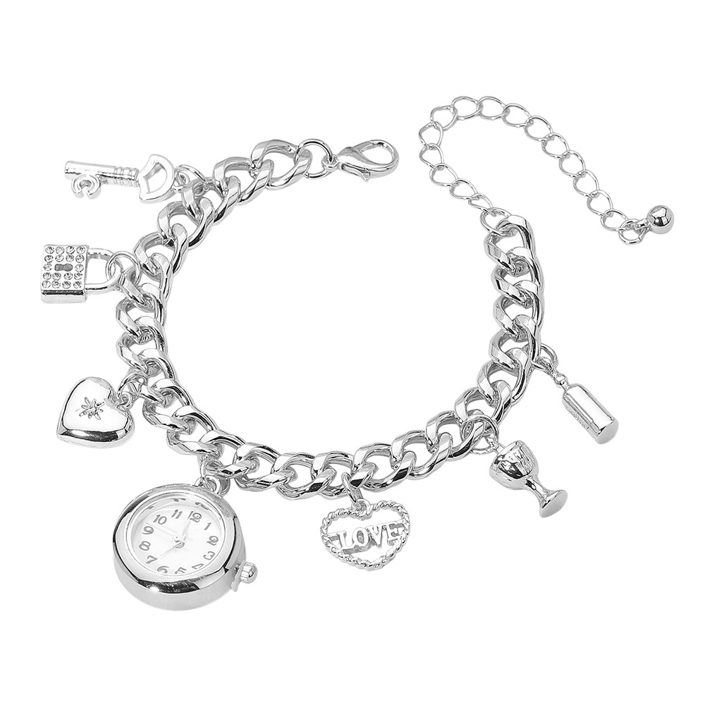 Details • Size : 0.4" H, 7.5" + 3" L • Charm Size : 0.9" L • Lobster Clasp Closure • Add sparkle and romance to your wrist with this love charm bracelet watch. Designed with a polished chain and detailed charms including a heart, key, and goblet, it perfectly blends fashion and function, making it an ideal accessory for both everyday and special occasions. • Sterling Silver Dipped • Lead and Nickel Compliant