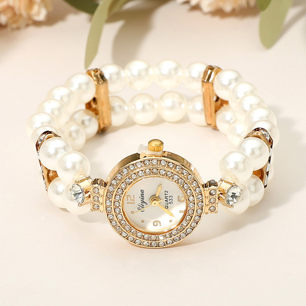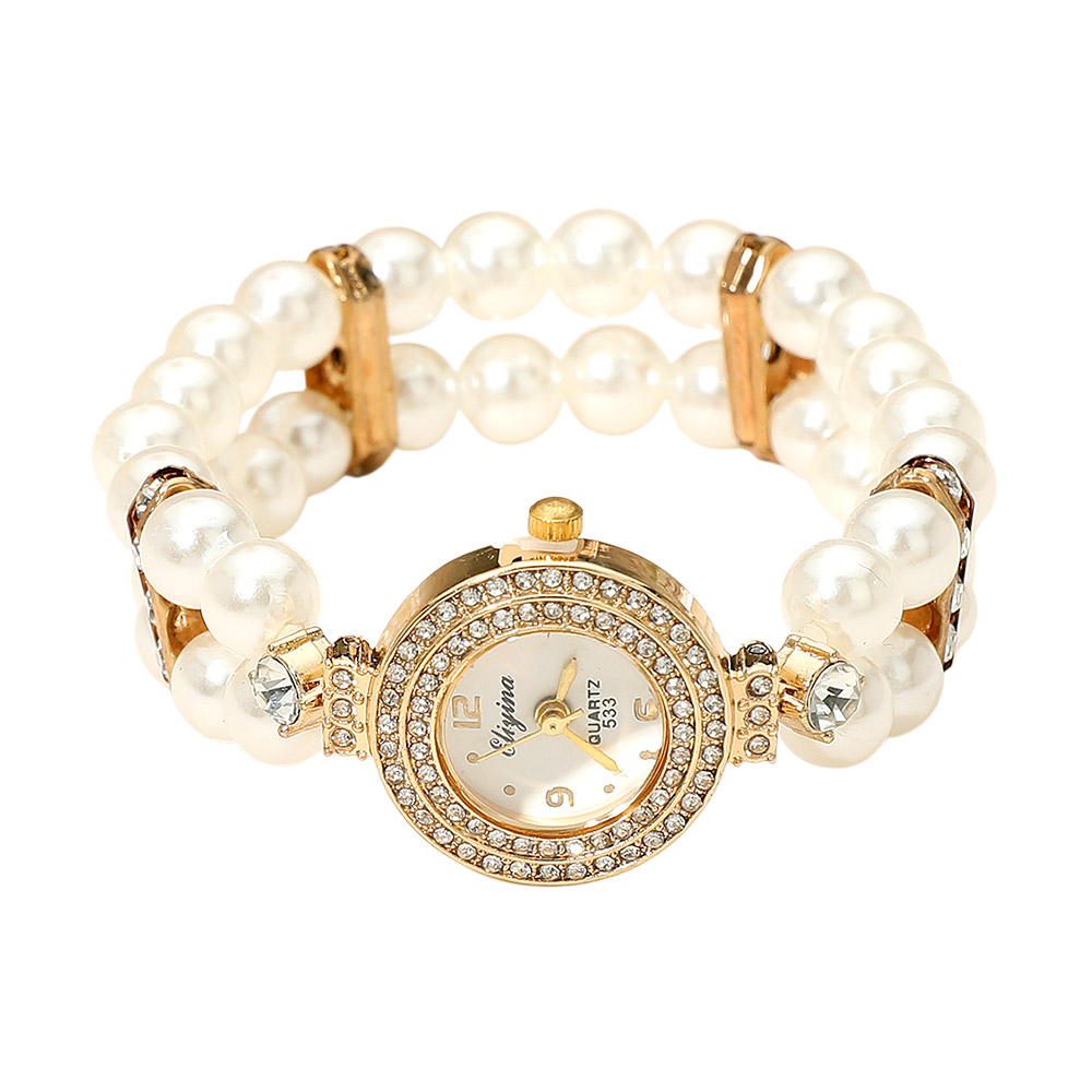 Details • Size : 0.9" H • Stretchable • Elevate your style with this double pearl strap quartz watch featuring a rhinestone-encrusted bezel. Its bracelet-inspired design blends elegance with functionality, making it a perfect accessory for weddings, parties, or everyday sophistication. • Stainless Steel