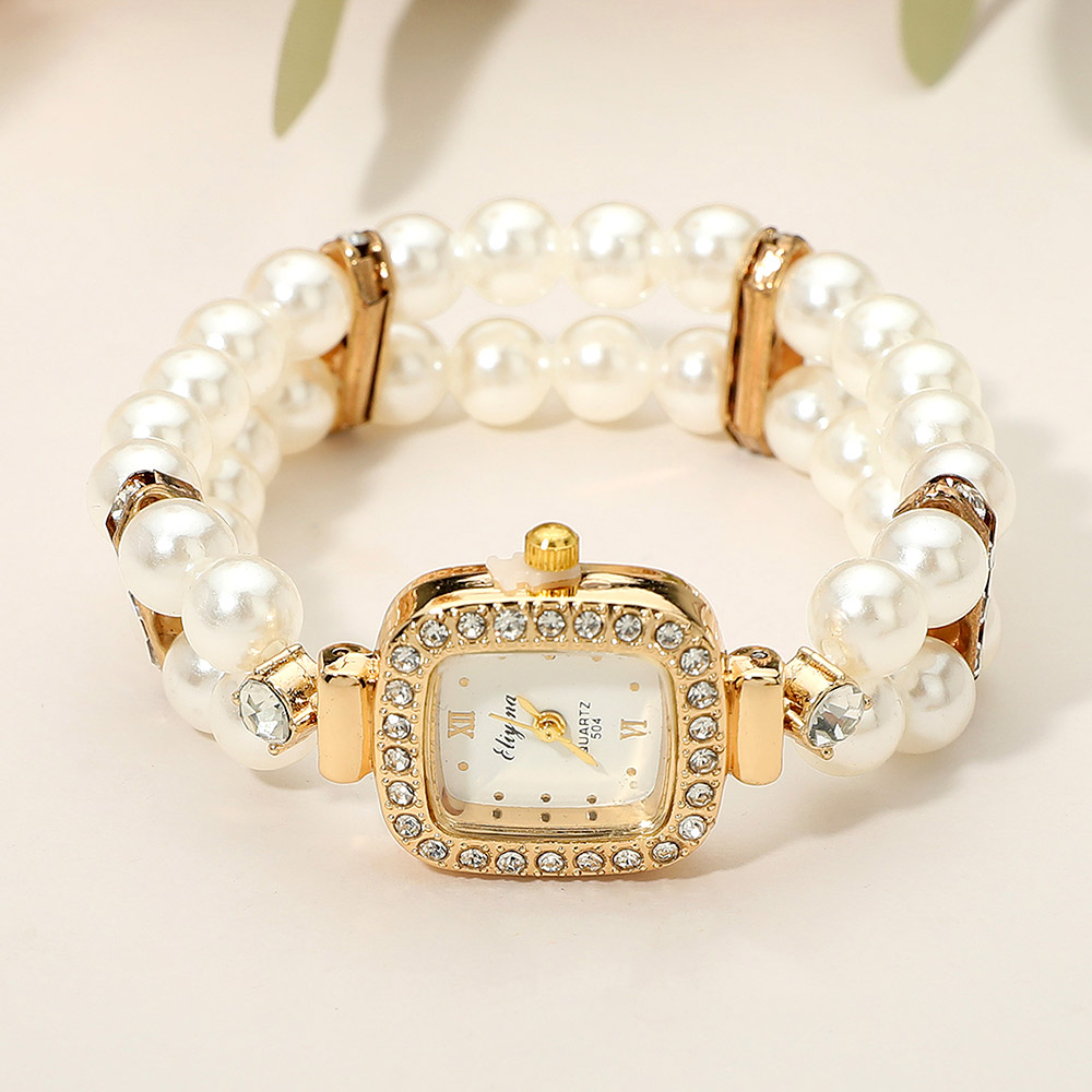Details • Size : 0.8" H • Stretchable • Refined and feminine, this square dial quartz watch features a double pearl strap and a bezel adorned with sparkling crystals. Its timeless design blends elegance with everyday practicality, making it a standout accessory for both special occasions and daily wear. • Stainless Steel