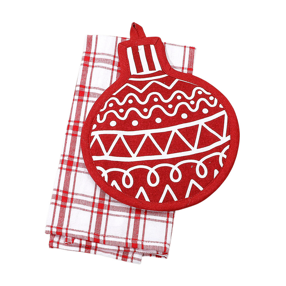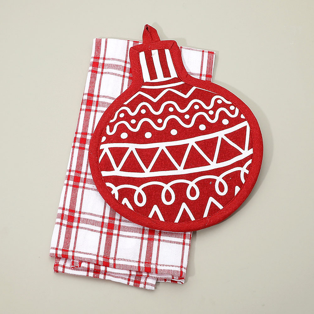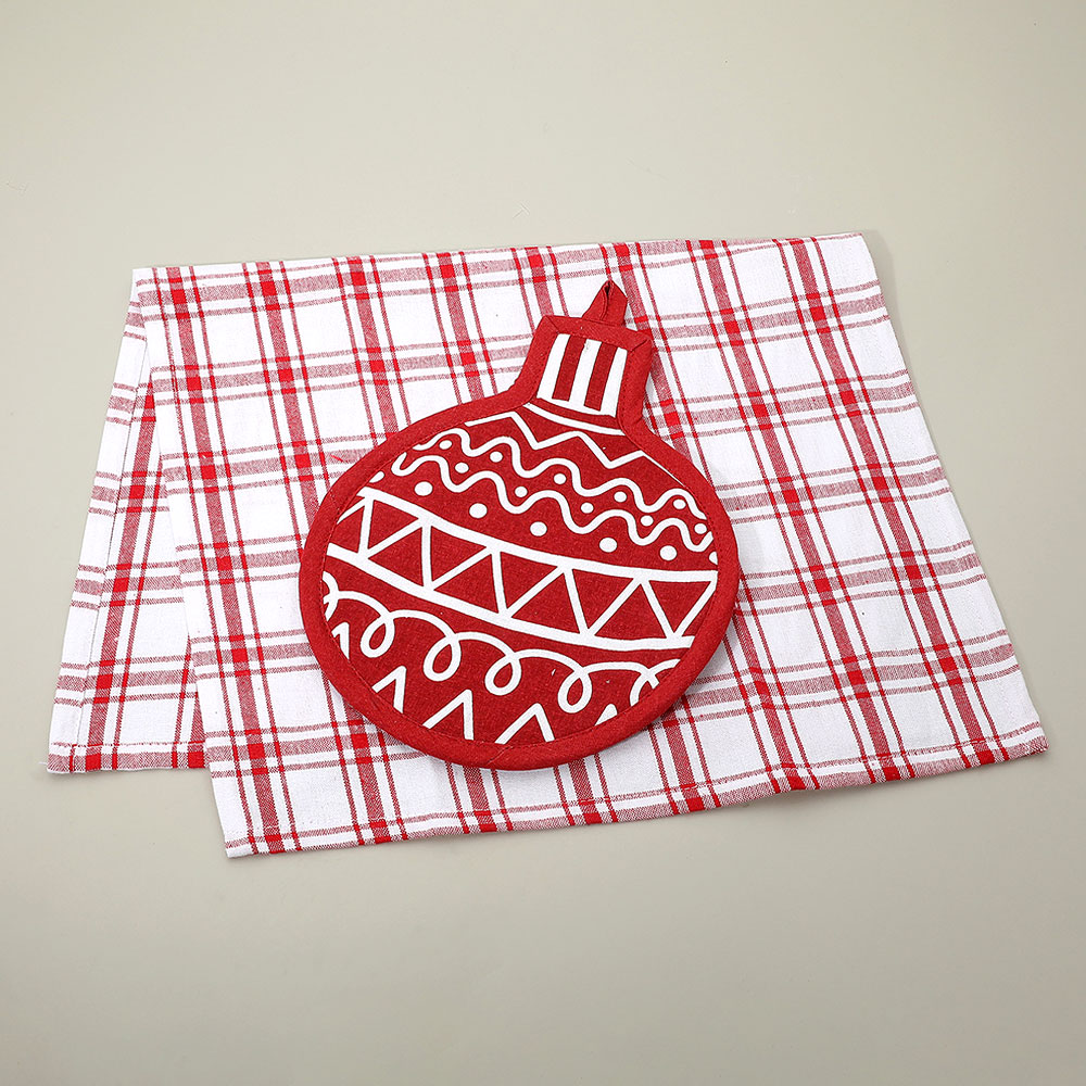 Details • Towel Size : 15" X 25" • Potholder Size : 8.25" X 10.25" • Material : 100% Cotton • Holiday Ornament Kitchen Set – Festive 2-piece kitchen set with an ornament-shaped potholder and plaid towel. Perfect for decorating, cooking, or gifting during the holidays. Bring warmth and holiday cheer to your kitchen with this charming seasonal set. • Made In India