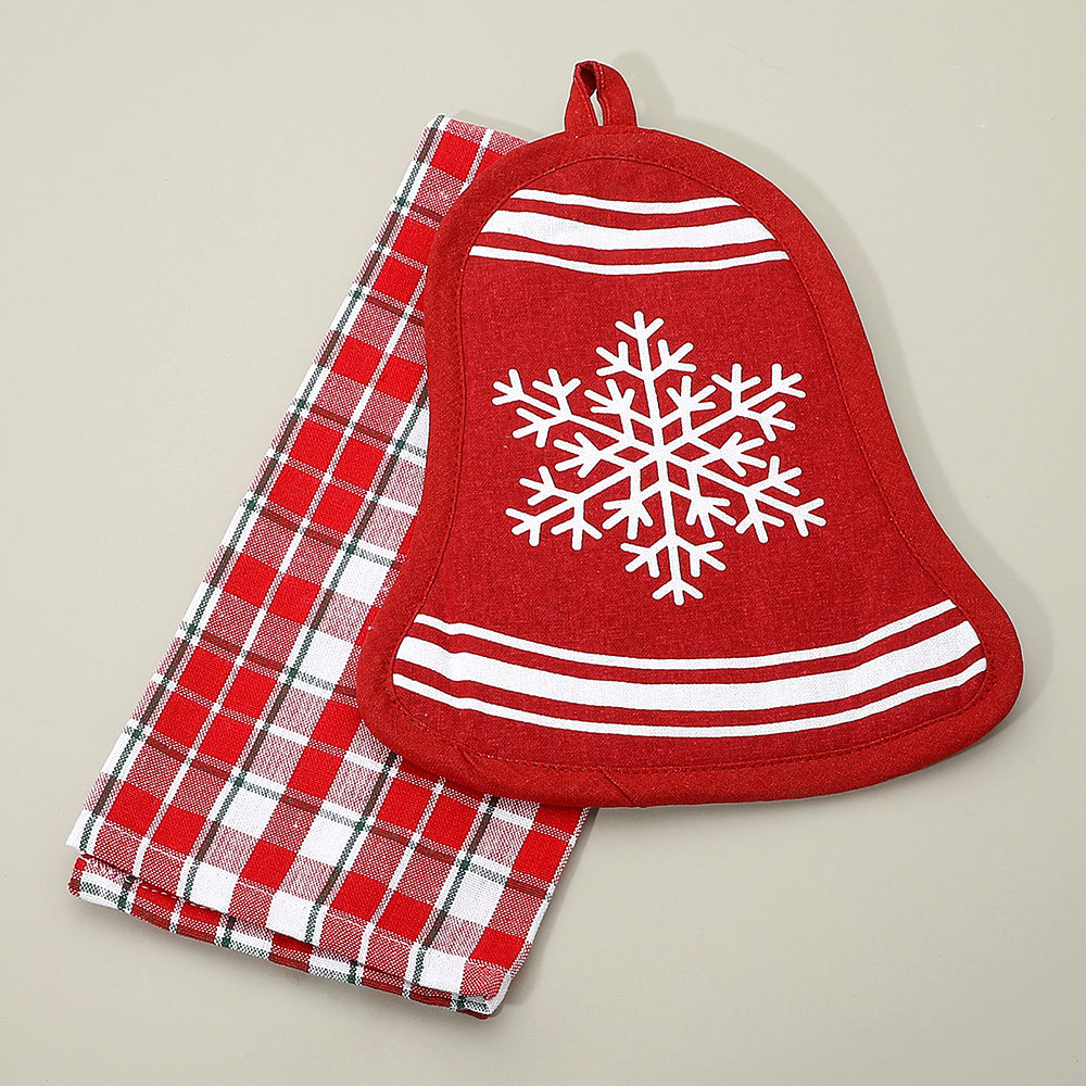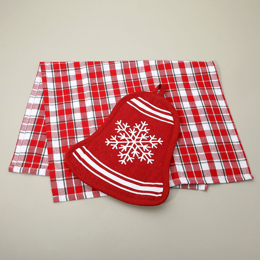 Details • Towel Size : 15" X 25" • Potholder Size : 8.75" X 10.25" • Material : 100% Cotton • Holiday Bell Snowflake Kitchen Set – A 2-piece festive kitchen set featuring a bell potholder and plaid towel. Perfect for cooking, baking, or decorating your kitchen with a touch of seasonal charm. A thoughtful and stylish holiday gift for home cooks. • Made In India