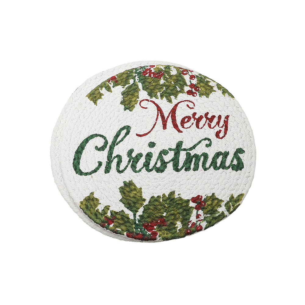 Details • Size : 9" X 9" • Material : 100% Cotton • Add festive charm to your holiday table with these round placemats featuring a “Merry Christmas” greeting and holly accents. Perfect for seasonal dining, parties, and entertaining, this set of 2 blends practicality with cheerful holiday style. • Made In India