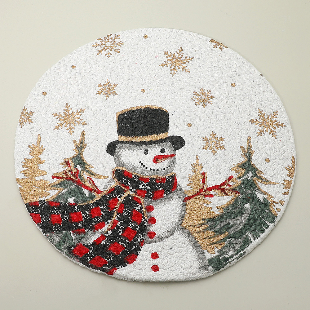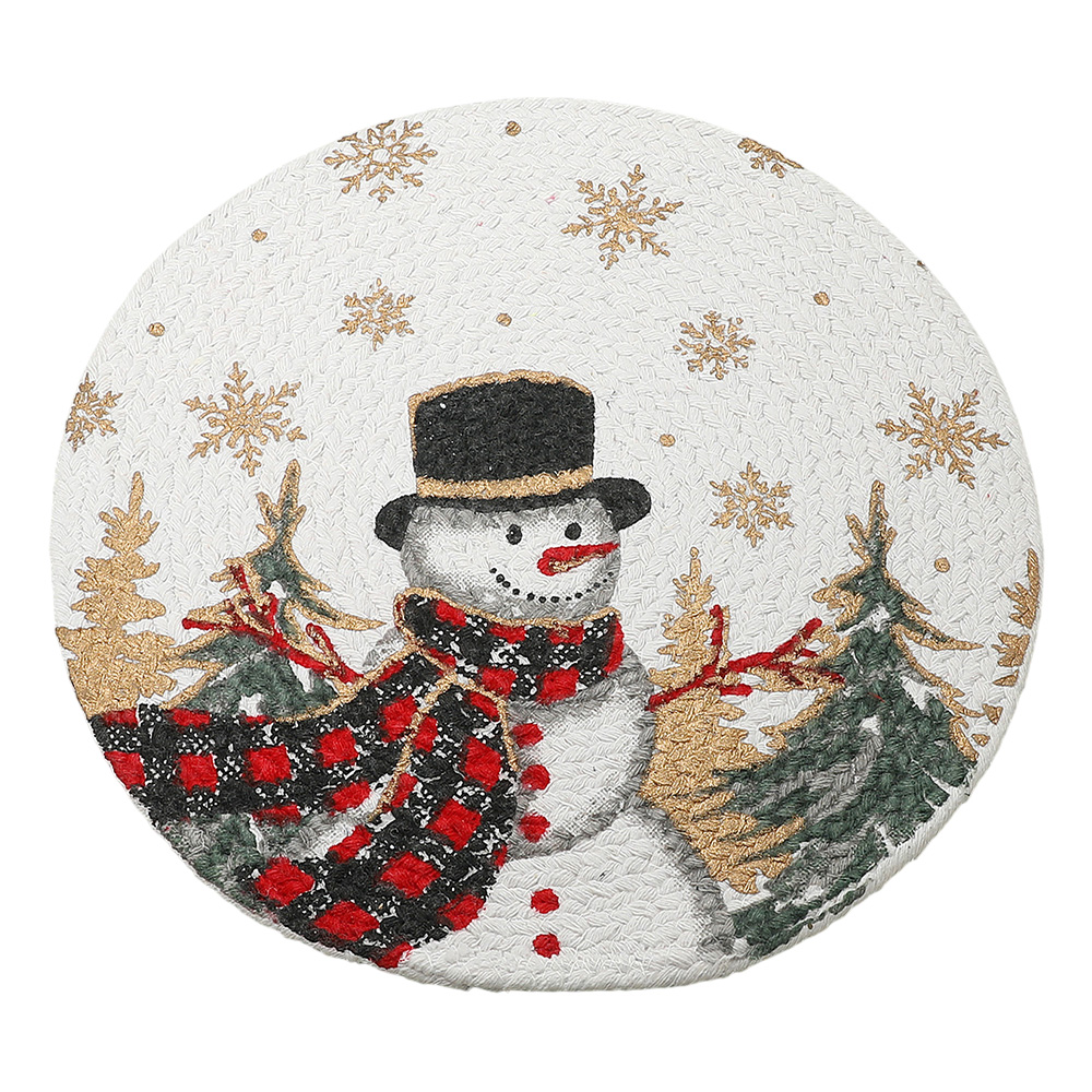 • Add a cheerful holiday touch to your table with this 14-inch round placemat featuring a snowman in a checkered scarf, surrounded by Christmas trees and golden snowflakes. Perfect for festive dining dĂ©cor.