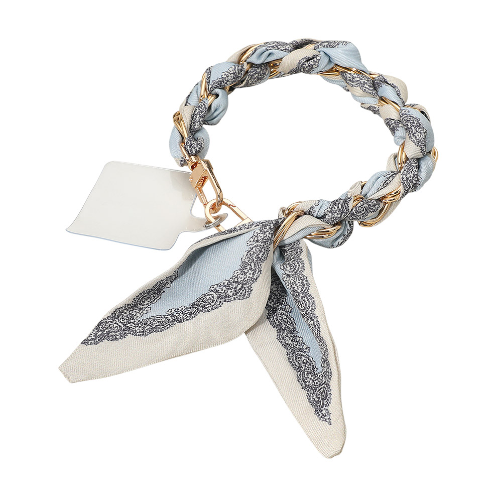 • Upgrade your phone style with this elegant scarf chain wrist strap, combining a braided design with metallic links for a chic and functional look. The soft scarf accent adds flair while providing a comfortable grip, making it perfect for carrying your phone in effortless fashion.