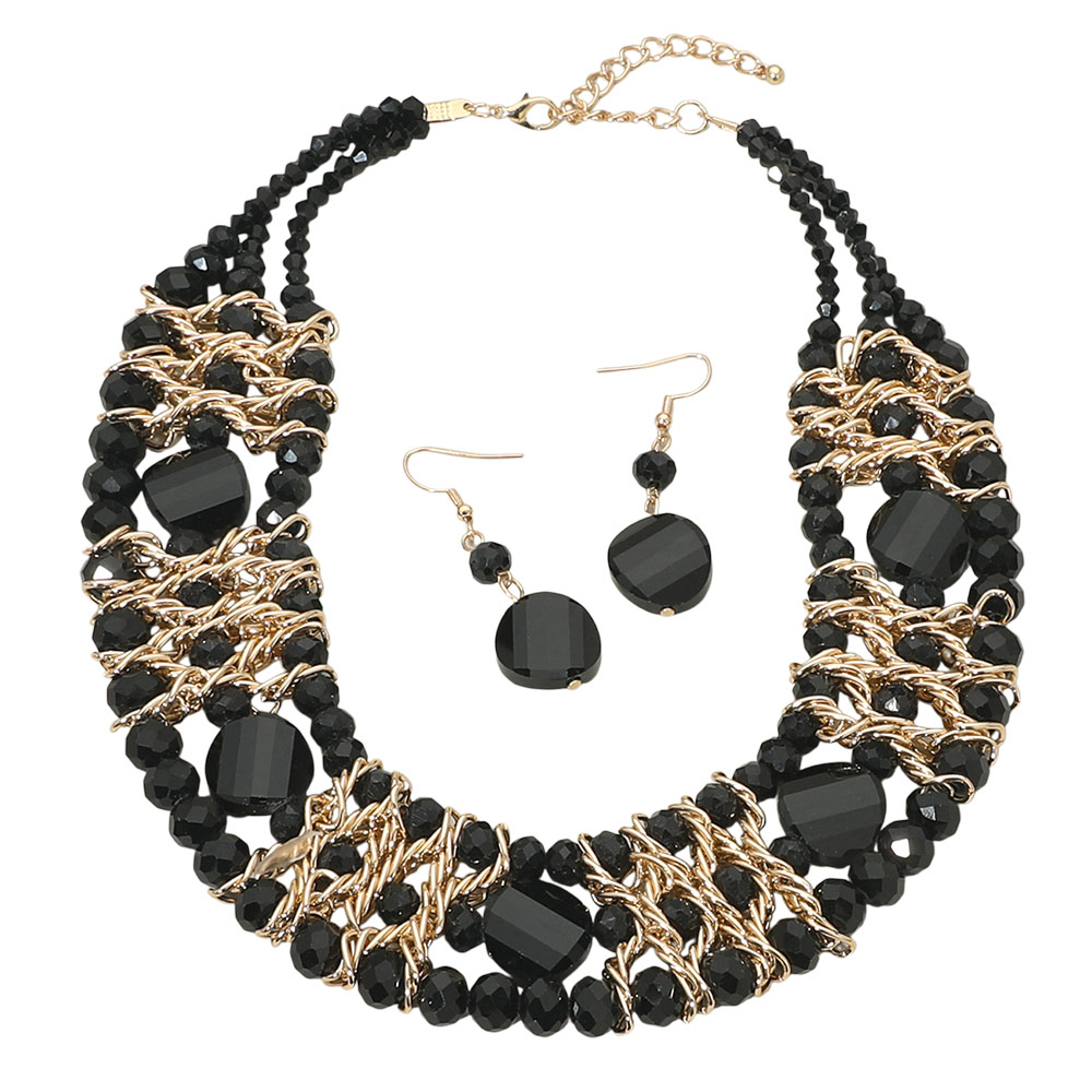 • Bold multi strand statement necklace set featuring layered faceted bead detailing with matching drop earrings. Designed for boutique styling, evening outfits, and special events, this coordinated jewelry set delivers eye-catching texture, dimensional shine, and elevated impact for dresses, blouses, and occasion-ready looks.